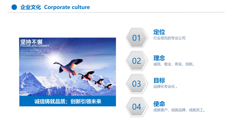 企業(yè)精神:務(wù)實(shí)、高效、嚴(yán)謹(jǐn)。市場(chǎng)意識(shí):思路決定出路;競(jìng)爭(zhēng)貴在品質(zhì)。